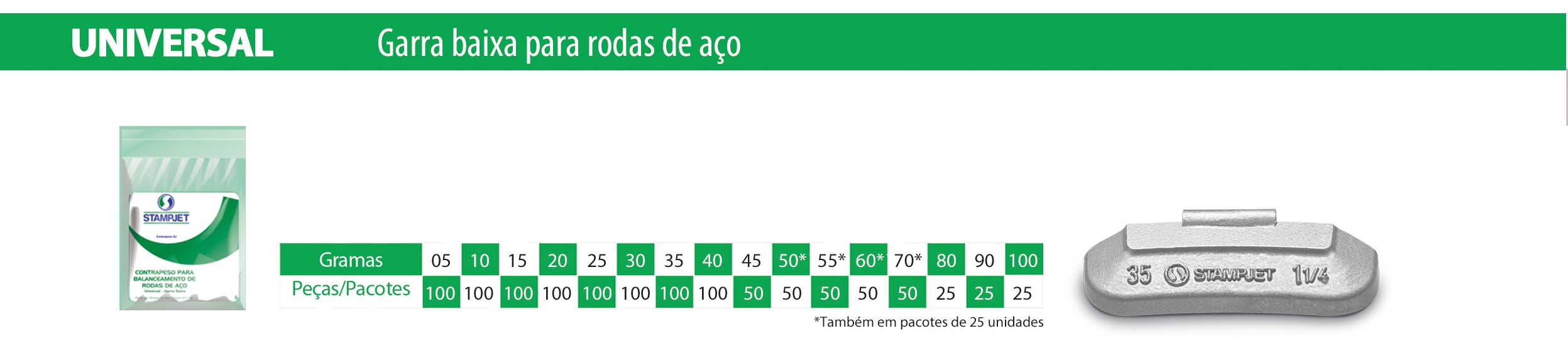 |  | | [7000] Contrapeso Stampjep llantas de chapa o standar |  | Contrapesos Stampjep. Origen Brazil. Para llantas standard. Excelente calidad y agarre. Certificación iso 9001 y UKAS. | | Consultar |  |